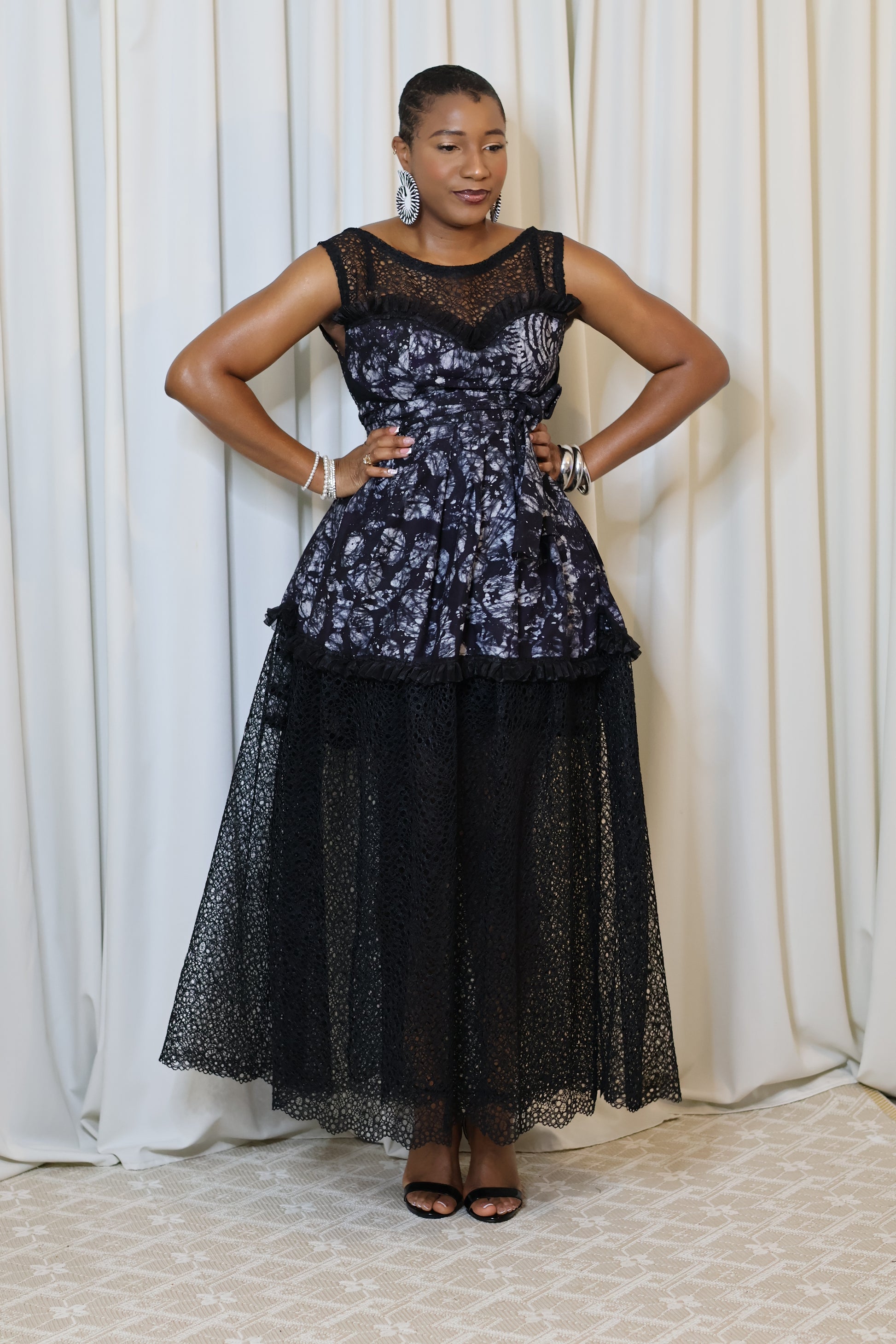 Son portefeuille en batik captivant s'épanouit en plis généreux, créant une silhouette fluide et majestueuse.