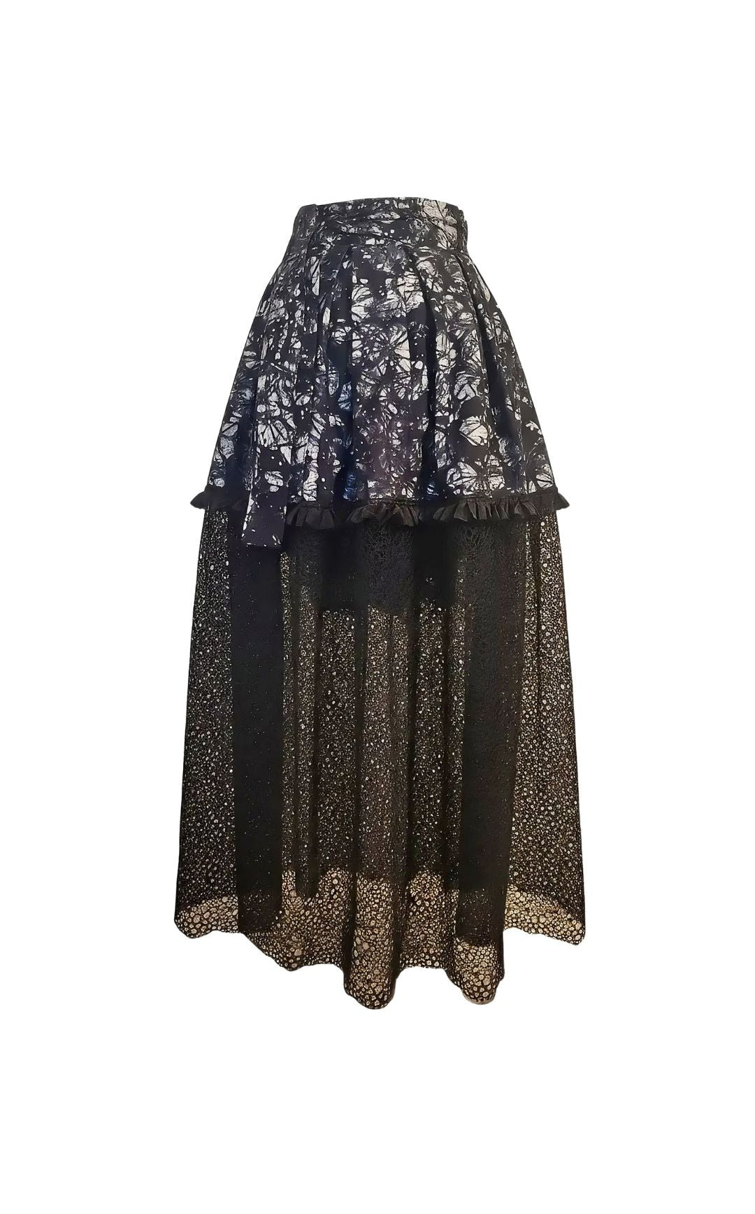 À partir des genoux, le tissu brodé délicat prend le relais, révélant une sensualité subtile à chaque mouvement. Cette harmonie entre la richesse du batik et l'élégance de la broderie crée une pièce véritablement envoûtante.